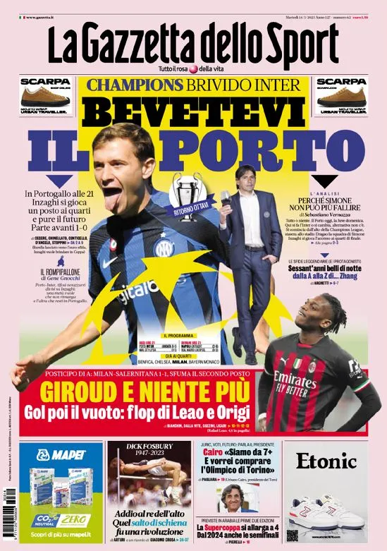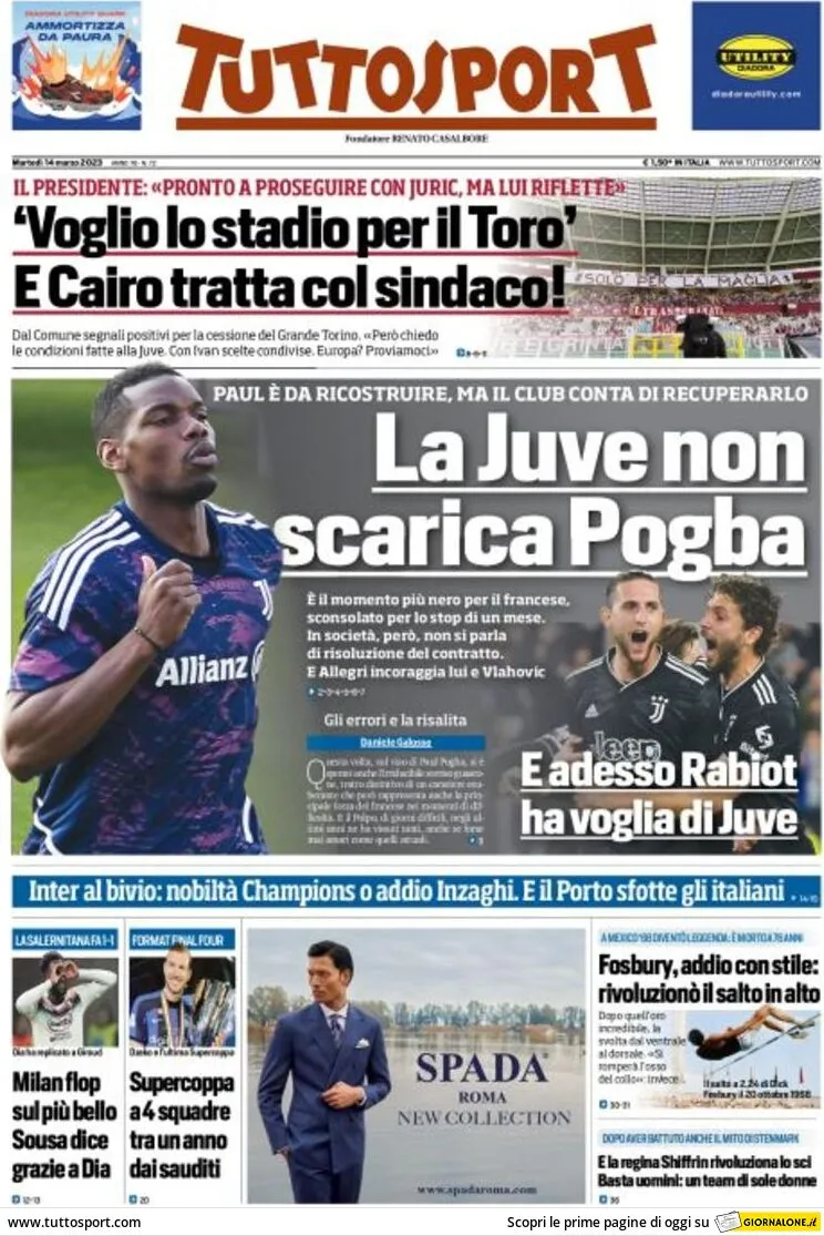 Di seguito sono riportate le prime pagine dei principali quotidiani sportivi di oggi, martedì 14 marzo 2023.